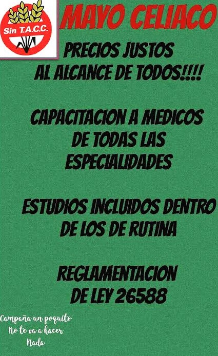 La ley 26.588, entre otras cosas, establece que las obras sociales brinden asistencia económica a los celíacos. El año pasado, entre las modificaciones que se le hicieron y que aún no fueron reglamentadas, se agregaron puntos como que el sector gastronómico pueda ofrecer al menos en sus menúes, una opción libre de gluten y que lo mismo suceda en los hospitales, las escuelas, unidades carcelarias y servicios de transportes.