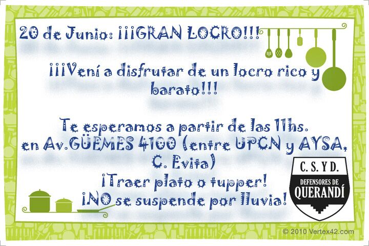 Gran locro este 20 de junio en Ciudad Evita 19 junio, 2017 En el día de la bandera, el Club Social y Defensores de Querandí realizará un gran locro, es por ello que se invita a todas las familias a disfrutar de un día patrio espectacular.
