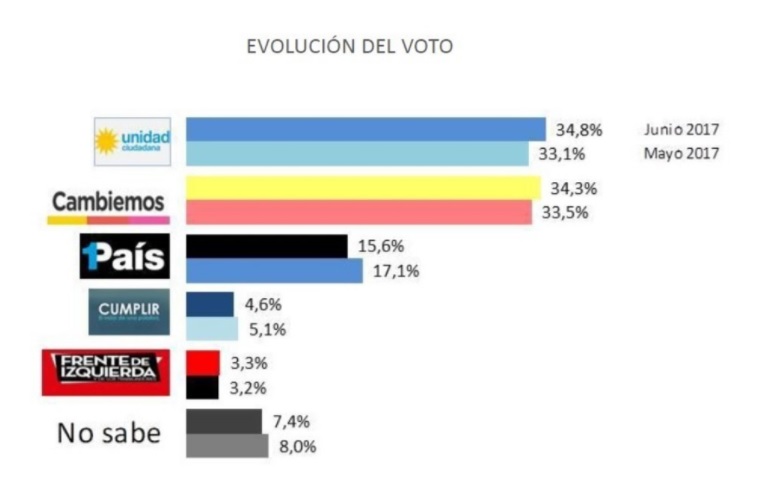 • CFK-Vallejos por Unidad Ciudadana y los candidatos de Cambiemos Bullrich y Ocaña (se consultó por los candidatos de la Gobernadora Vidal) mantiene el virtual “empate técnico”: 34,8% y 34,3% respectivamente, aunque se invirtió el orden respecto a mayo (33,1% y 33,5%).