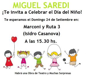 Dentro del marco del pasado mes del día del niños se llevará a a cabo su celebración que tendrá lugar el día Domingo 24 de Septiembre, en Marconi y Ruta 3, en la localidad de Isidro Casanova, en el horario de las 15.30hs