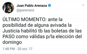 Dada la posibilidad de que se registren avivadas en las próximas elecciones del 22 de octubre, la Justicia Electoral habilitó como válidas las boletas que se usaron en las Paso de agosto. Para que se imposibilitan algunas maniobras, según lo afirmó Juan Pablo Arenaza en su Twitter