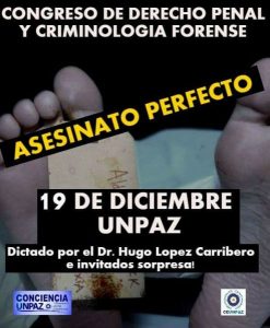 La temática será sobre asesinato perfecto, y se realizará el 19 de diciembre, en la UNPAZ, Universidad Nacional de Jose C. Paz, en Alem 4731