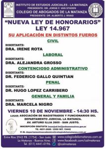 El día viernes 10/10, en el horario de las 14:00hs, se realizará una disertación acerca de la nueva ley de honorarios, y su aplicación en los diferentes fueros.