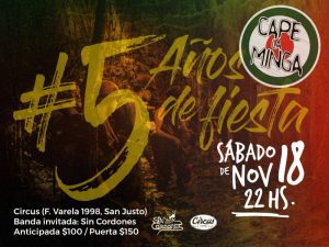 Dentro del marco del evento «5 años de fiesta», el sábado 18/11, estará tocando la banda «Cape La Minga», y también como banda invitada estará «Sin Cordones».