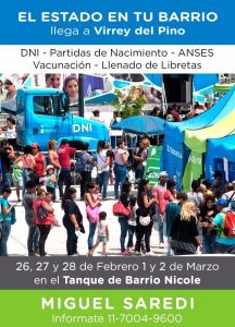 El Dr. Miguel Saredi, Concejal por La Matanza, nos contó que desde el Lunes 26/02 hasta el viernes 2/03, el operativo del Estado en tu Barrio regresa al partido de La Matanza, en el Tanque de Barrio Nicole, en la localidad de Virrey del Pino.