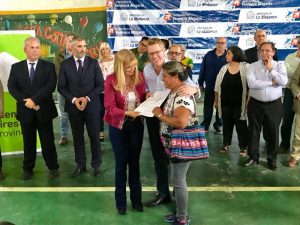 En la entrega de Títulos, Veronica Magario y Juan Curutchet (Presidente del Banco Provincia)
