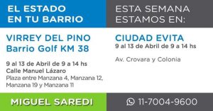 El Concejal por La Matanza, el Dr. Miguel Saredi nos contó que desde el 9/04 hasta el 13/04, habrán dos operativos del Estado en tu Barrio en La Matanza, uno en la calle Crovara y Colina, en la localidad de Ciudad Evita, y el segundo en la calle Manuel Lázaro, en la plaza entre la manzana 4, manzana 12, manzana 19 y manzana 11, en el Barrio Golf, en la localidad de Virrey del Pino.