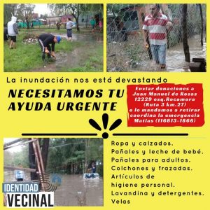 “También hay instituciones como Identidad Vecinal, que junto a muchos trabajadores , docentes y voluntarios trabaja y ayuda. Si querés ayudar a las familias inundadas de La Matanza contactate con Identidad Vecinal 11 6813 1866″