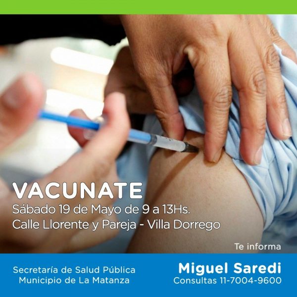 El Concejal por La Matanza, el Dr. Miguel Saredi destaca el operativo de Vacunación que se realizará mañana 19/05 en la calle Llorente y Pareja, en Dorrego.