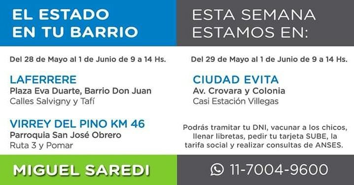 Consultado al respecto el Dr. Miguel Saredi nos dijo: “Te acercamos las soluciones que vos y tu familia necesitan a través de los servicios de El Estado en tu Barrio los vecinos de La Matanza pueden resolver sus trámites, cerca de su casa, de una manera fácil, rápida y sin intermediario”