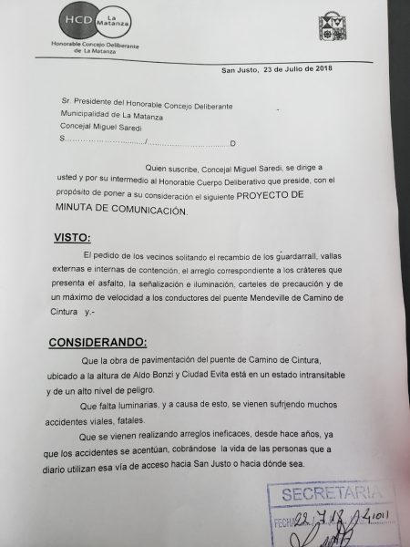 El Vicepresidente del Honorable Concejo Deliberante de La Matanza, Dr. Miguel Saredi, presentó un reclamo formal como legislador, debido al deplorable estado del puente de Camino de Cintura, ubicado a la altura de Aldo Bonzi y Ciudad Evita. El cuál, se ha llevado la vida de muchos vecinos.