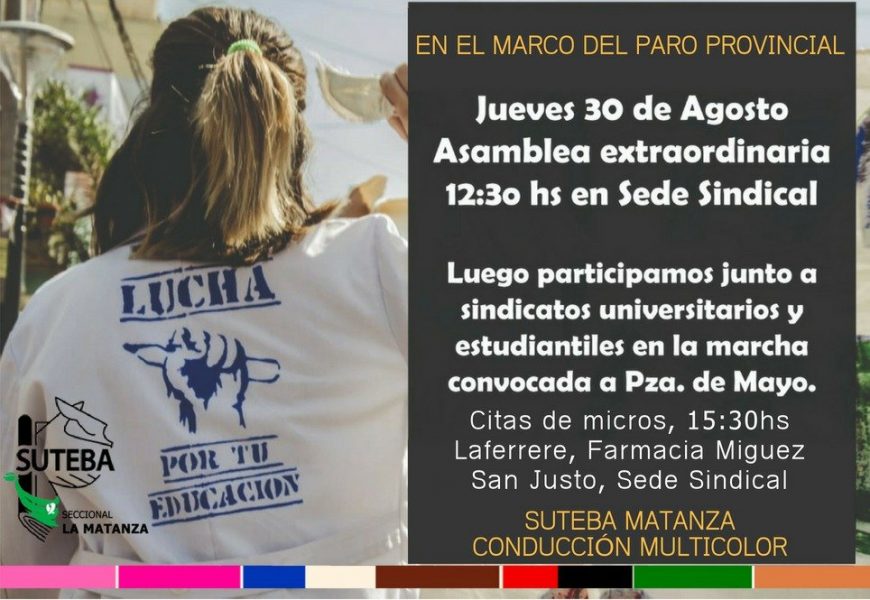 Suteba pone a disposición micros de traslado que saldran desde Laferrere en la Farmacia Miguez y en San Justo en la Sede Sindical, en el horario de las 15:30hs.