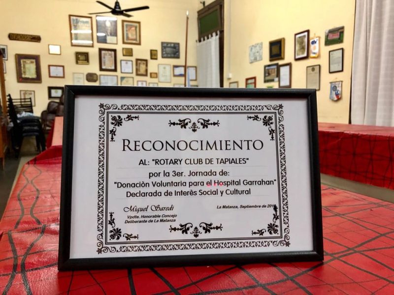 El Dr. Miguel Saredi, vicepresidente del Honorable Concejo Deliberante de La Matanza, entregó un reconocimiento al Rotary Club de Tapiales, por la 3er. Jornada de Donación de Sangre para el Hospital Garrahan. La misma, fue considerada de interés Social y Cultural.