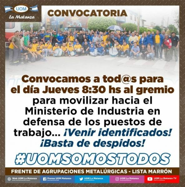 La UOM de La Matanza acompañará la movilización convocada por la UOM para este próximo jueves hacia el ministerio de Industria en defensa de los puestos de trabajo.