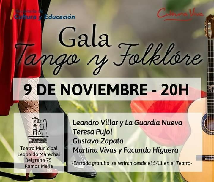 Así nos informó el Dr Saredi “ este viernes 9/11 a las 20 hs en el Teatro Municipal «Leopoldo Merechal», Casa de Cultura de Ramos Mejía, (Belgrano, 75) se podrá ver una nueva edición del ciclo de música y danzas tradicionales de #CulturaViva con Teresa Pujol, Leandro Villar y La Guardia Nueva, y el guitarrista Gustavo Zapata, acompañado por los bailarines Martina Vivas y Facundo Higuera, que presentarán una gala que combinará melodías tradicionales del folklore argentino con compases del tango del tango rioplantense “