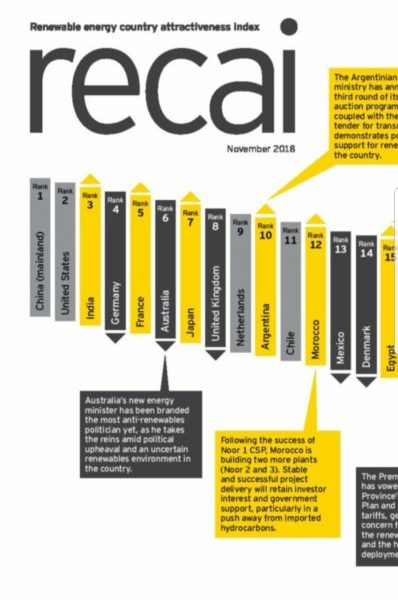 Kind exhibió en esos encuentros las planillas del Indice Recai (Renewable Energy Country Attractriveness Index) elaborado por la consultora británica E&Y (Ernst & Young Global Limited).