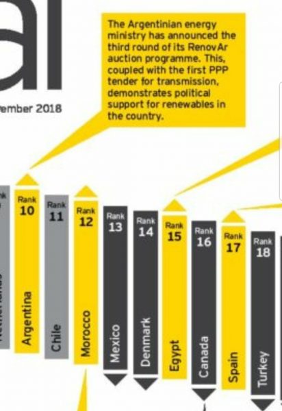 «La Argentina entra por primera vez en el top 10, con el gobierno demostrando apoyo político para la energía renovable», resaltó el estudio.