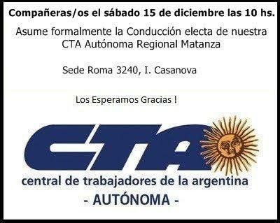 El día sábado 15 de diciembre a las 10am se realizará el acto de asunción formal de la conduccion de la cta de La Matanza.