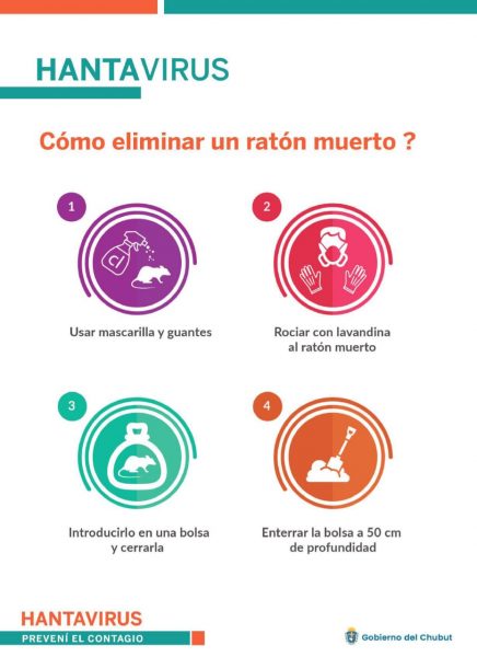 – Si se encuentra un roedor muerto: rociarlo con lavandina junto con todo lo que haya podido estar en contacto y esperar un mínimo de 30 minutos. Luego recogerlo usando guantes y enterrarlo a más de 30 cm de profundidad o quemarlo.