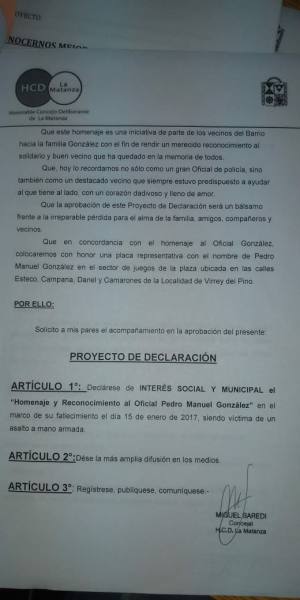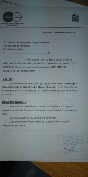 El Vicepresidente del Honorable Concejo Deliberante de La Matanza, Dr. Miguel Saredi, presentó un Proyecto de Declaración para el Homenaje y Reconocimiento al Oficial Pedro Manuel González.
