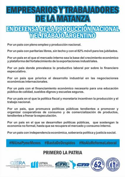A continuación compartimos los reclamos de dicho evento, recorda que podes asistir o participar desde las redes sociales con los hashtag #NiUnaPymeMenos #BastaDeDespidos y #NoALaReformaLaboral: