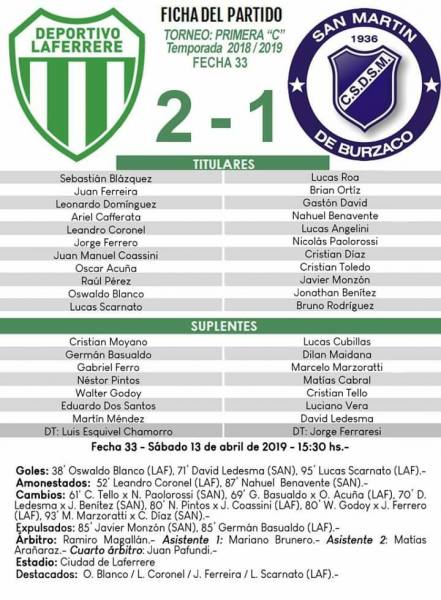 En la fecha 33, ganó Laferrere 2 a 1 frente a San Martín de Burzaco.