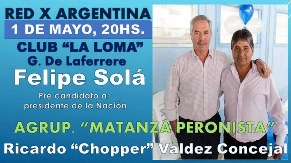 Para conmemorar el Día del Trabajador, este miércoles, el precandidato presidencial y diputado nacional Felipe Solá encabezó un acto en el club La Loma, de la localidad de Gregorio Laferrere, junto a la mayor parte de los dirigentes que acompañan su frente, Red por Argentina, que brega por la unidad del peronismo, entre ellos el Concejal Ricardo «Chopper» Valdez, Fernando Asencio, entre otros