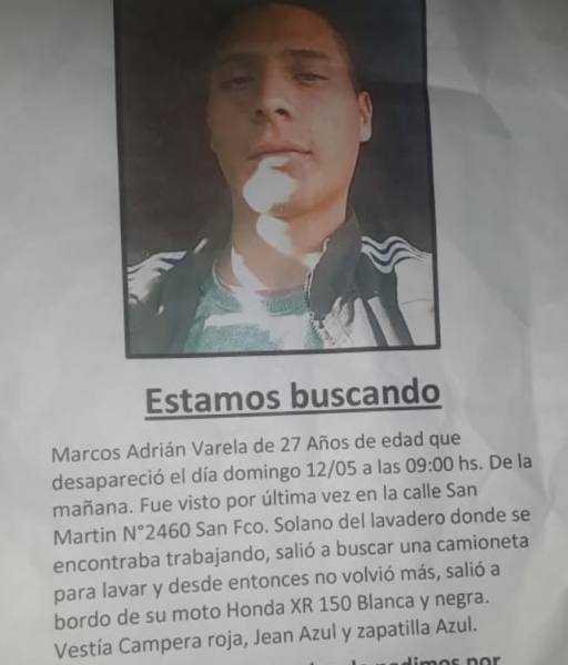 Familiares, amigos y vecinos de Marcos Adrián Varela, de 27 años de edad, quien desapareció el día domingo 12 de Mayo por la mañana, en la localidad de San Francisco Solano, en el distrito de Quilmes, piden colaboración para dar con su paradero.