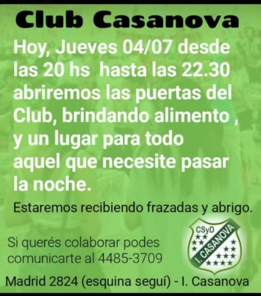 Hoy desde las 20:00hs hasta las 22:30hs se abrirán las puertas del Club Casanova, ubicado en Madrid 2824