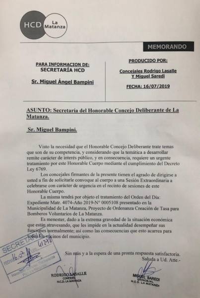El Dr. Rodrigo Lasalle, pidió que se convoque a una sesión extraordinaria y se trate urgentemente en el Concejo Deliberante, una ordenanza para que se resuelva la situación de una institución tan importante para la sociedad como los Bomberos Voluntarios de La Matanza, a partir del pedido planteado por las autoridades de la entidad encabezadas por su presidente, Gustavo Cid.