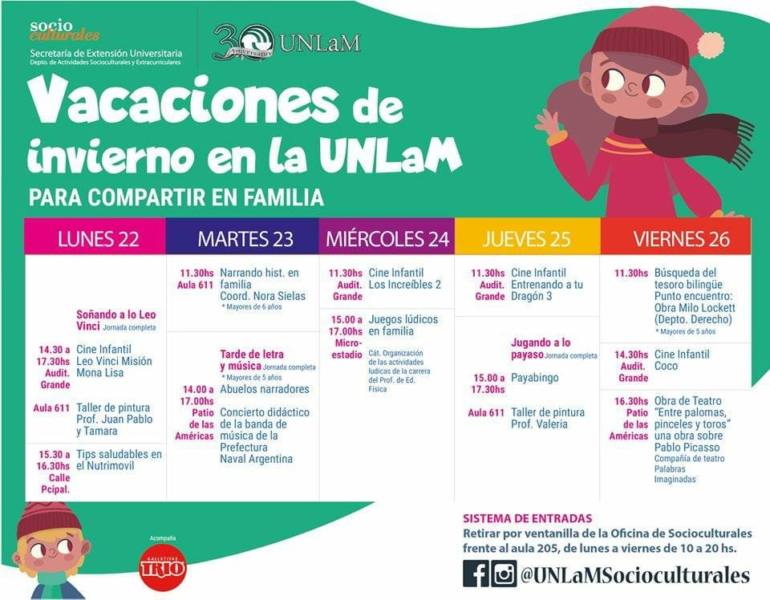 Organizadas mediante la Secretaria de Extensión Universitaria, las actividades se extenderán hasta el viernes 2 de agosto, de lunes a viernes, en la sede de San Justo de esta Casa de Altos Estudios, ubicada en Florencio Varela 1903.