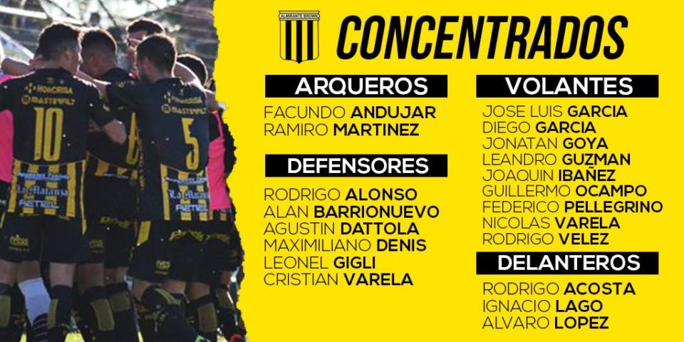 Hoy juega Almirante Brown frente a Urquiza 7 octubre, 2019 Almirante Brown ya tiene los concentrados para jugar hoy lunes desde las 15:30 ante Urquiza. A continuación compartimos los confirmados: