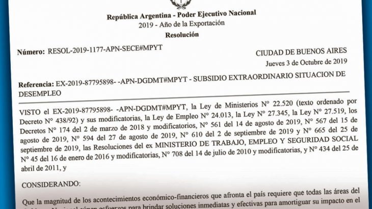 La resolución 1177 de la Secretaría de Empleo, firmada el 3 de octubre por el jefe del área, Fernando Prémoli, quedó circunscripta a una circulación interna en la cartera que encabeza Dante Sica y hasta ayer no había sido publicada en el Boletín Oficial. La norma consagró la creación del “Subsidio Extraordinario Situación de Desempleo” de $ 5.000 por única vez para desocupados “mayores de 18 años” con DNI, CUIL y que no percibieran otros ingresos vía prestaciones sociales o previsionales. Y fijó el 8 de noviembre como fecha tope para el cobro.