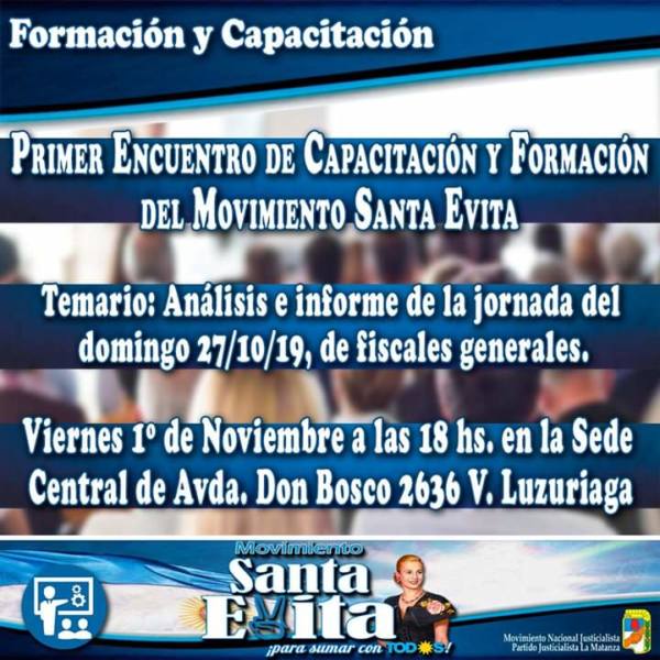 El viernes 1 de noviembre a las 18 hs se realizará un encuentro de formación y capacitación dirigido por el Movimiento Santa Evita. El encuentro se llevará a cabo en la sede Central de Av. Don Bosco 2636, Villa Luzuriaga.