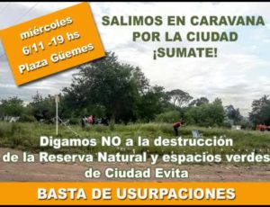 Hoy miércoles 6/11, vecinos marcharan en Caravana desde la Plaza Güemes, localidad matancera de Ciudad Evita, en reclamo por la destrucción de la Reserva Natural y espacios verdes.