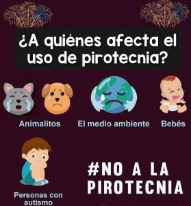 En animales el uso de pirotecnia genera taquicardia, temblores, aturdimiento, pérdida de control, miedo y/o muerte. Los efectos son diversos y de diferente intensidad y gravedad. Los animales escuchan con mayor intensidad que un ser humano.