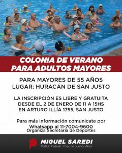 Se realizará en el Club Huracán de San Justo y habrá distintas actividades de las que pueden disfrutar como aquagym, baile y actividades de campo. La inscripción será a partir del 2 de enero de 11 a 15 horas en Av. Presidente Dr. Arturo Illía 1755 en San Justo.