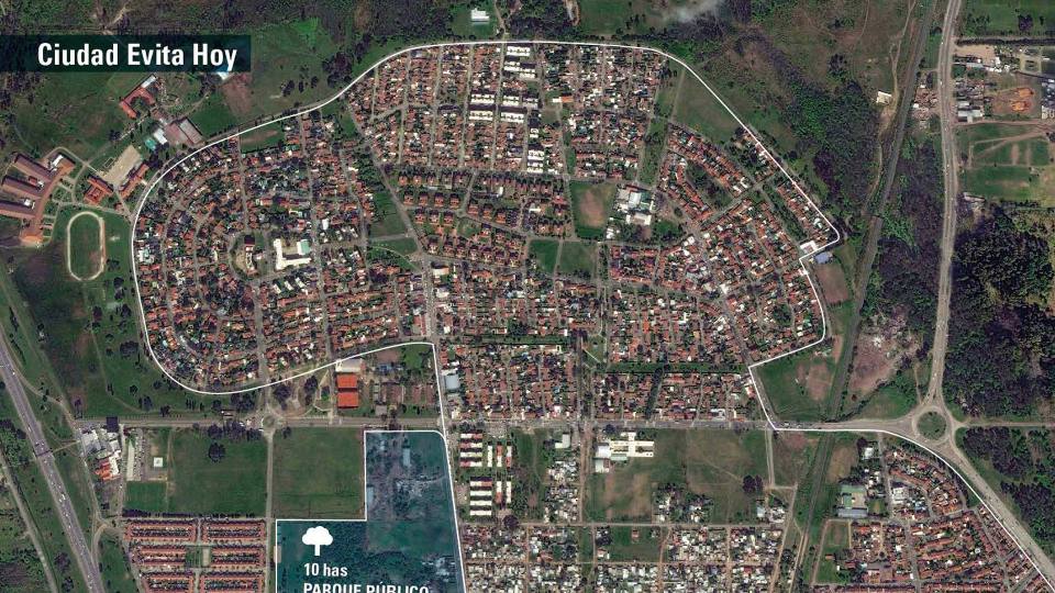 En 1947 el presidente Juan Domingo Perón ordenó expropiar las tierras de la actual ciudad para la contrucción de 15.000 viviendas. El diseño fue realizado en forma de perfil de «Evita» peinada con su clásico moño en forma de rodete, con su brazo en alto.