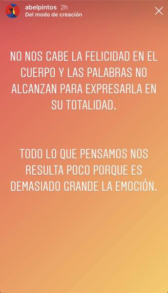 «No nos cabe la felicidad en el cuerpo y las palabras no alcanzan para expresarla en su totalidad«, arrancó diciendo el músico en una historia de Instagram. Y siguió: «Todo lo que pensamos nos resulta poco porque es demasiado grande la emoción«, resaltó.
