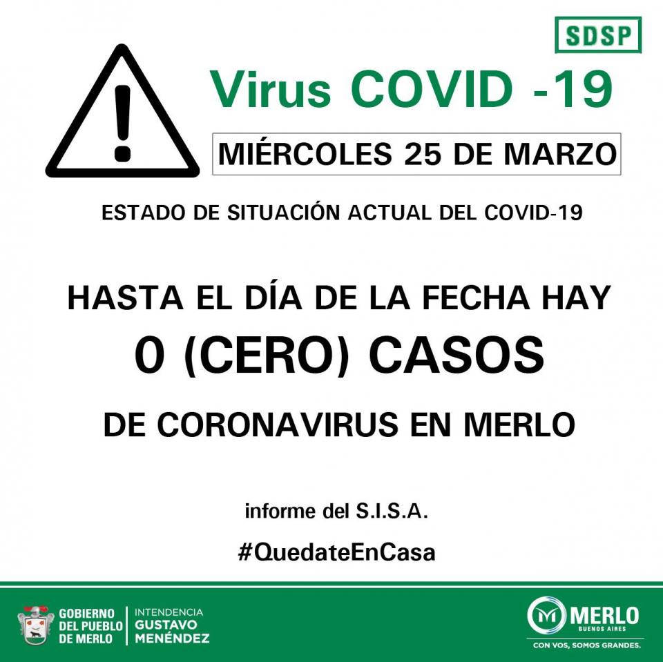 Asimismo desde el municipio se informó que a la fecha de hoy Miércoles 25 de marzo, no hay casos confirmados de Coronavirus en Merlo.