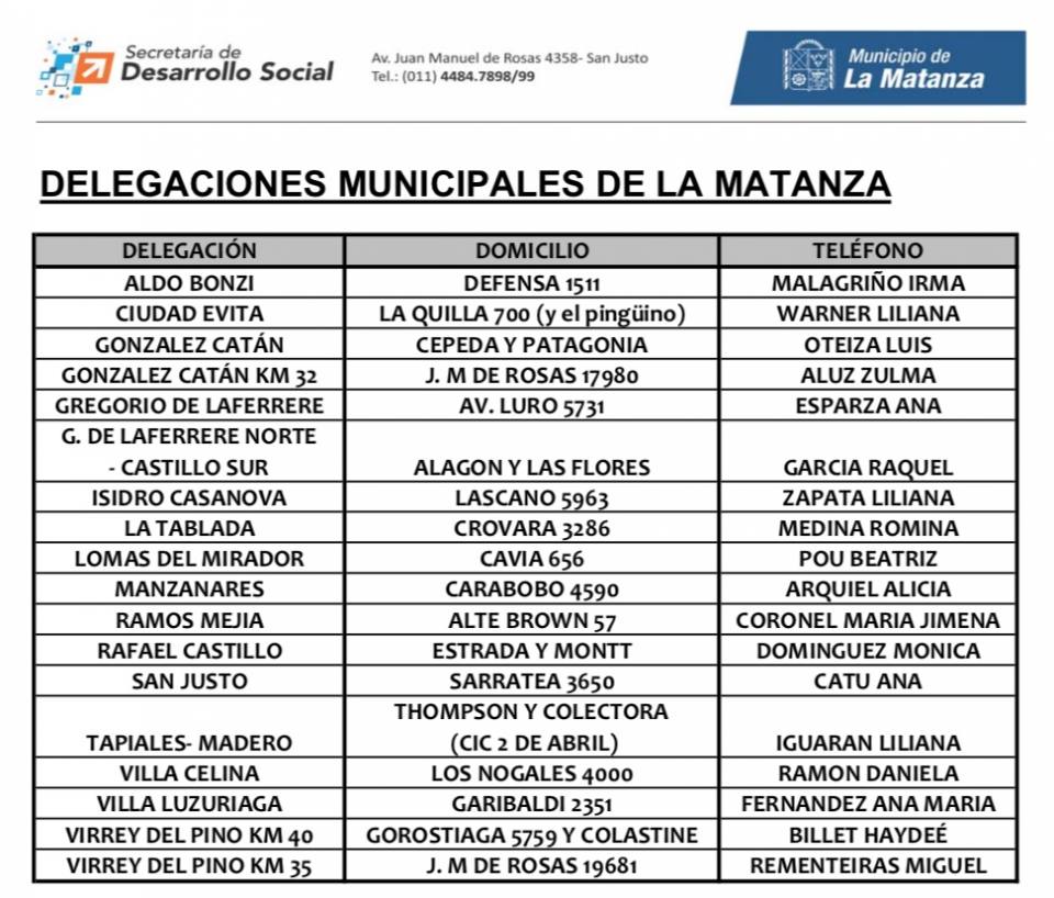 “Otra posibilidad, es acercarse a la Secretaría de Desarrollo Social de La Matanza, ubicada en J. M. de Rosas 4358 en la localidad de San Justo -cosa que por éstos días no recomiendo-, pero es teniendo en cuenta qué hay familias qué tal vez, no puedan acceder por internet”, resaltó Saredi.
