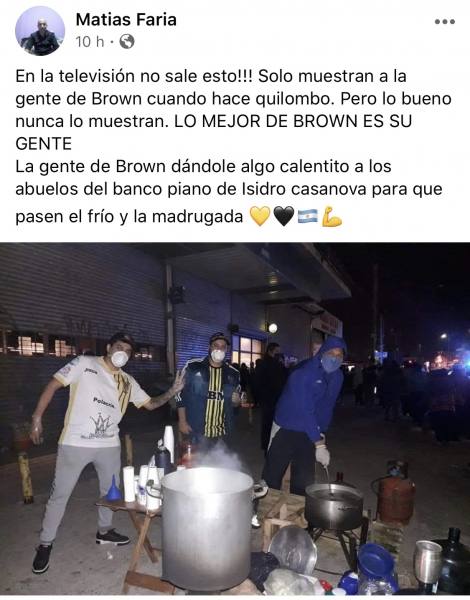 «En la televisión no sale esto, sólo muestran a la gente de Brown cuando hace quilombo. Pero lo bueno nunca lo muestran. LO MEJOR DE BROWN ES SU GENTE» decía Matias Faria en un posteo que se viralizó en las redes sociales.