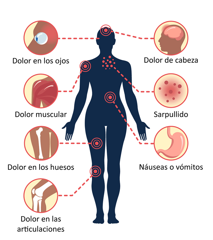 Es un cuadro febril con erupción cutánea y dolores musculares, entre otras. Los síntomas del dengue se inician después de un período de incubación que puede variar de cinco a ocho días tras la picadura y las personas suelen presentar