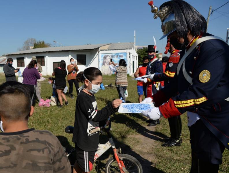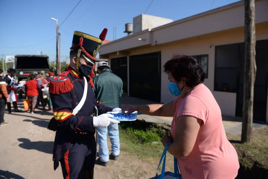En el marcó del día de la Escarapela, mientras soldados del Ejército Argentino continúan distribuyendo el almuerzo en los barrios más postergados, el Regimiento de Patricios, el Regimiento de Granaderos a Caballo y el Regimiento de Artilleros de Iriarte entregan escarapelas a los vecinos de La Matanza.