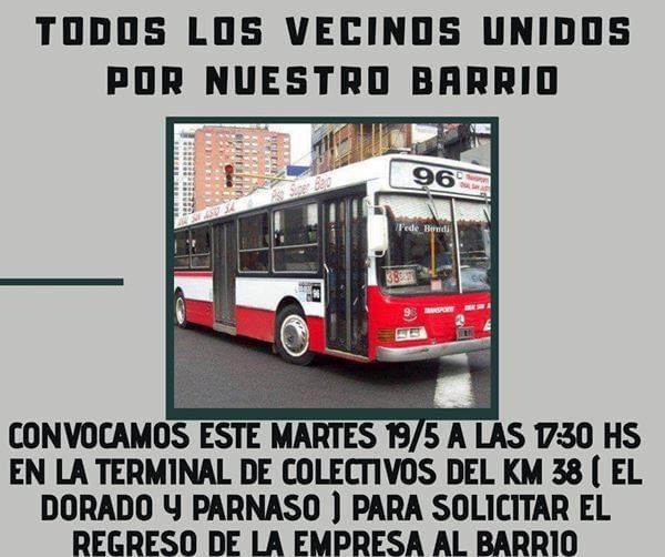 Los usuarios de las lineas 96 y 621 plantean la necesidad urgente de que ambos ramales ingresen nuevamente al barrio. En la actualidad los recorridos finalizan en el KM 32.