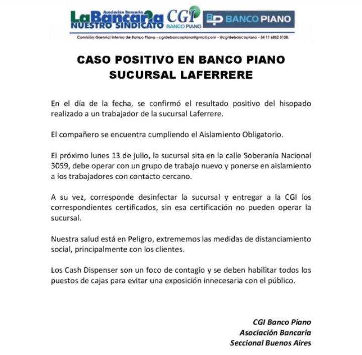 A través de un comunicado oficial, autoridades del sindicato CGI del Banco Piano expresaron: «Nuestra salud está en peligro, extrememos las medidas de distanciamiento social, especialmente con los clientes. Los cash dispenser son un foco de contagio y deben habilitar todas las cajas para evitar una exposición innecesario con el público».