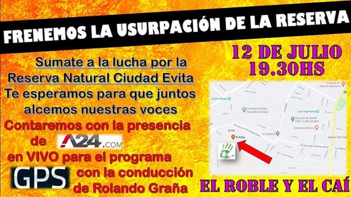 Hoy los vecinos se reunen hoy a las 19:30hs en las calles El Roble y El Caí para reclamar la usurpación de la Reserva Natural y el avance de obras.