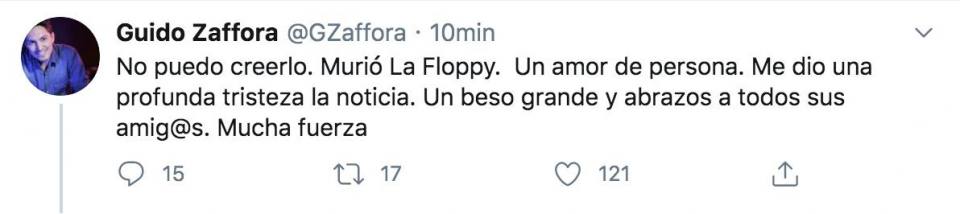 Tras conocerse la trágica noticia, el periodista Guido Zaffora compartió un mensaje totalmente conmovido: “No puedo creerlo. Murió La Floppy. Un amor de persona. Me dio una profunda tristeza la noticia. Un beso grande y abrazos para todos sus amig@s. Mucha Fuerza”.