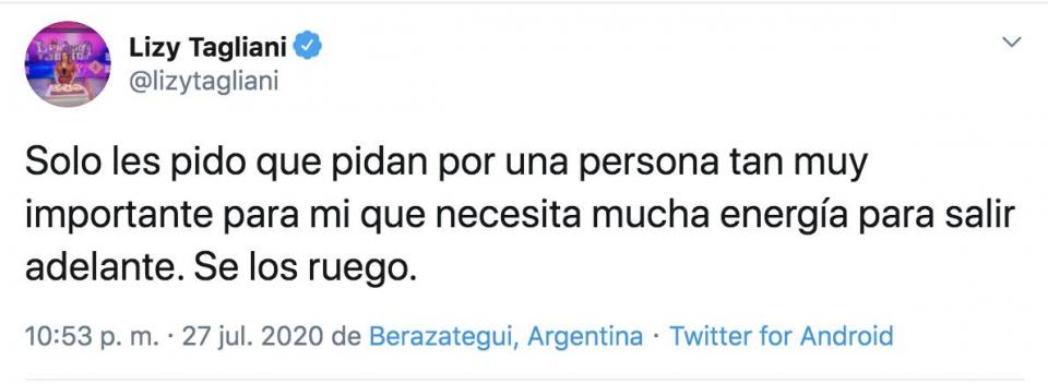 “Solo les pido que pidan por una persona tan muy importante para mi que necesita mucha energía para salir adelante. Se los ruego”, escribió Lizy.
