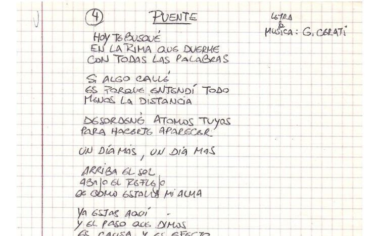 Manuscrito de Gustavo de la letra del tema “Puente”, perteneciente al álbum “Bocanada” y realizado para el registro autoral de la obra. pic.twitter.com/cMfis2j65O